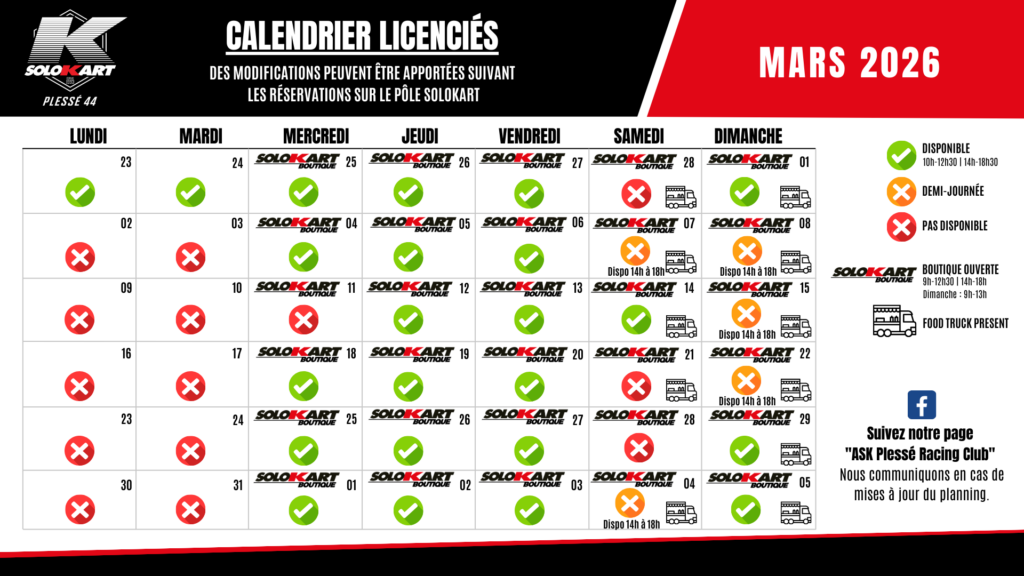 Le pôle SOLOKART accueillant de nombreux événements, le planning de roulage est réalisé en fonction des disponibilités du circuit.